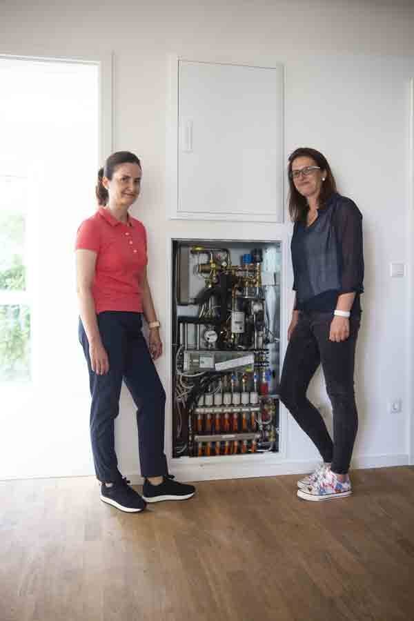 Die Uponor GmbH lieferte die gesamte Lösung bestehend aus 56 Wohnungsstationen, zwei Pufferspeichern mit jeweils 1.500 Litern, Filtersystemen sowie einer vorgefertigten Pumpengruppe inklusive Regelungstechnik. „Eine Lösung aus einer Hand – das bietet Sicherheit, denn alle Systemkomponenten sind aufeinander abgestimmt“, sind sich die TGA-Planerinnen Anne Kilz und Heike Mandler einig.