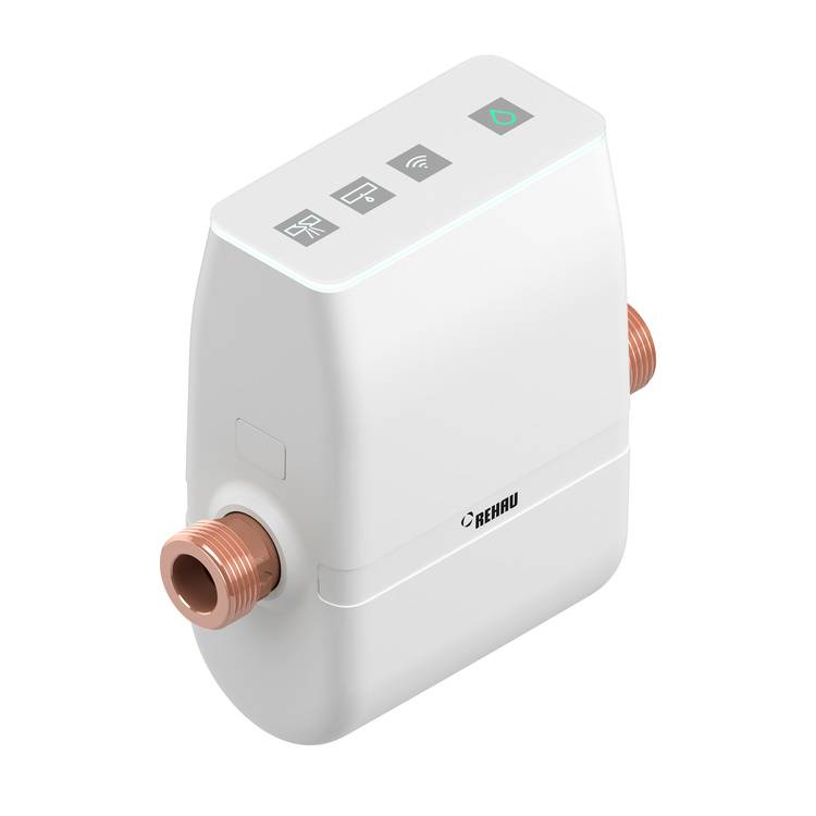 Das Steuerungsgerät wird direkt in die Hauptwasserleitung eingebaut. Für die Messung des Wasserdurchflusses setzt Rehau auf präzise Ultraschalltechnik, die so optimiert ist, dass sie Druckverluste minimiert. Die ermittelten Werte vergleicht das Gerät mit vorher definierten Grenzwerten und erkennt hierdurch zuverlässig Rohrbrüche und Tropfleckagen. Bemerkt es eine Leckage wird die Hauptwasserleitung sofort abgeschaltet.