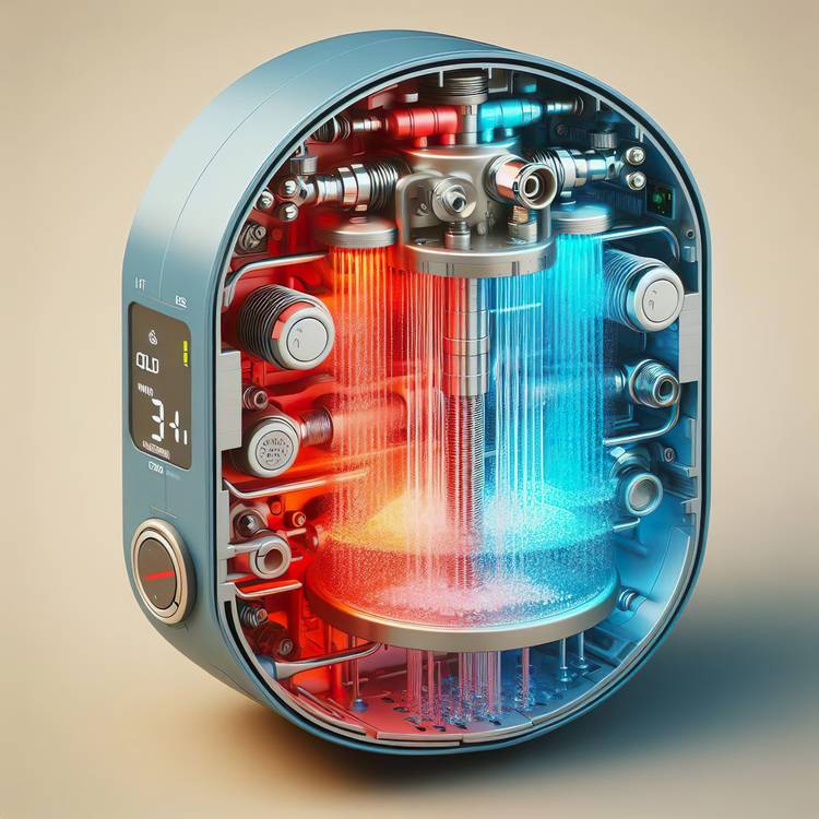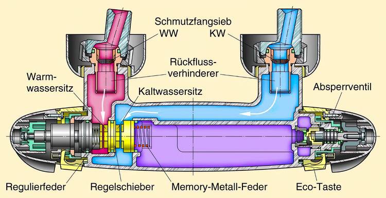 Ein Dehnstoff bewegt die Sperre nach rechts oder links. In dem jeweils sich einstellendem Mischwasserstrom, der die Batterie durchströmt, wird nämlich ein Dehnstoffelement eingebaut. Dieses Element registriert also zwangsläufig die abgehende Mischung aus Kalt- und Warmwasser. Der Dehnstoff wird sich bei einer Änderung des Warmwasserstromes entsprechend verändern. Bei einer Erhöhung der Temperatur wird sich der Körper dehnen. Dabei wird dann also der Heißwasserstrom reduziert, während gleichzeitig der Kaltwasserzustrom vergrößert wird. Bei entsprechender Abkühlung des Stromes würde sich ebenfalls das Dehnstoffelement abkühlen und dabei die entgegengesetzte Veränderung auslösen. Also würde der Kaltwasserstrom gesenkt und gleichzeitig mehr warmes Wasser durchgeleitet. Es handelt sich also um eine einfache, aber sehr effiziente Regelung der Temperatur mittels Volumenstromänderung.