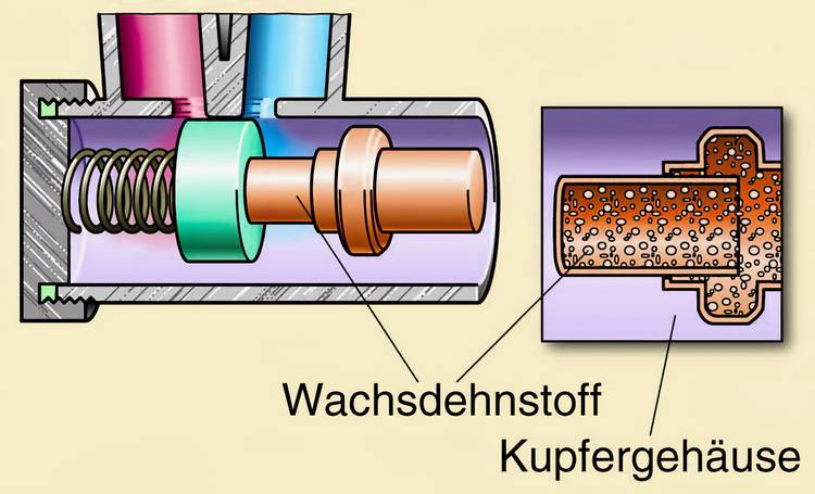 Funktionsschema zur thermostatischen Regelung der Temperatur mittels Dehnstoffelelement.