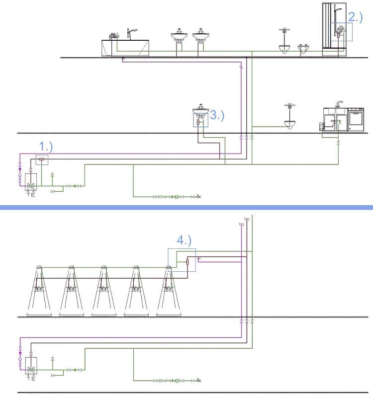 Oft setzt man daher die Thermostate kurz vor ­einer Gruppe von Verbrauchern. Dies kann dann eine Reihendusche oder eine ­Reihenwaschanlage sein. Das Wasser kann auf diese Weise dann durch das gesamte System mit hoher und damit bakterientötender Temperatur getrieben werden. Erst kurz vor den schützenswerten Dusch- und Waschanlagen oder anderen Verbrauchern würde eine Senkung der Temperatur mittels Thermostat stattfinden.