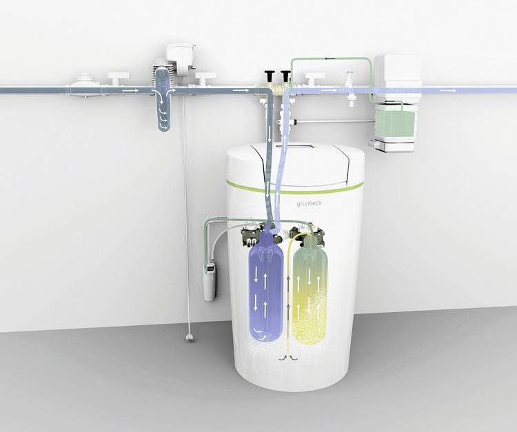 Hersteller wie beispielsweise Grünbeck setzen bei der Enthärtung auf das Ionenaustauschverfahren. Es ist die gängigste Methode, um in privaten und industriellen Liegenschaften enthärtetes Wasser herzustellen. Dabei bindet ein Harz sämtliche Calcium- sowie Magnesiumionen und tauscht sie gegen Natriumionen aus. Das so aufbereitete Wasser wird dann in der Regel auf eine Resthärte von 4 °dH verschnitten. Ist das Harz erschöpft, werden die Austauschbehälter mit Salzwasser gespült, um den Ausgangszustand des Harzes wiederherzustellen. Dieses Wasser gelangt in die Kanalisation. Nach diesem Prinzip arbeitet beispielsweise die softliQ-Serie. Die Anlage passt sich ihrem Verbrauch an und arbeitet mit einer vollautomatischen Steuerung sowie mit einem verschleißoptimierten Steuerventil. Die Modelle werden in den Varianten SC (bis zu 5 bzw. bis zu 12 Personen) und MC (bis zu 20 bzw. bis zu 30 Personen) angeboten. Insgesamt stehen dem Fachhandwerk damit vier Modelle zur Verfügung. Gesteuert werden sie entweder über das TFT-Farbdisplay oder über die myGrünbeck-App von unterwegs.