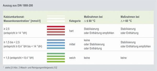 - Hart: mehr als 2,5 Millimol Calciumcarbonat je Liter, entspricht mehr als 14 °dH.