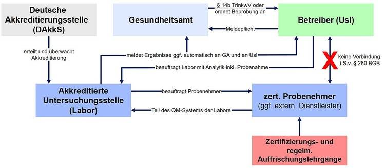§ 15 Abs. 4 Satz 1 der TrinkwV stellt ausdrücklich das Erfordernis auf, dass nicht nur die Untersuchung durch eine zugelassene Untersuchungsstelle zu erfolgen hat, sondern auch die jeweilige Probenahme. Das bedeutet, dass es aus rechtlicher Sicht gar kein Vertragsverhältnis zwischen Endkunde (UsI) und Probenehmer bzw. Dienstleister geben kann.