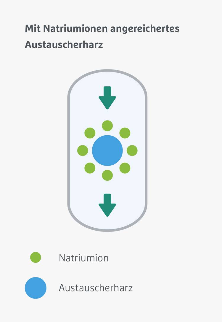 Bei der Enthärtung von Trinkwasser mittels Kationenaustausch werden die im Trinkwasser enthaltenen härtebildenden Calcium- und Magnesiumionen gegen Natriumionen ausgetauscht. (Abbildung 3) Dieser Austauschprozess findet so lange statt, bis das Kationenaustauscherharz erschöpft ist und keine Natriumionen mehr zur Verfügung stehen.
