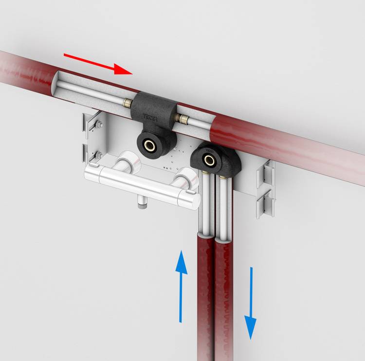 Zur besseren Einhaltung der Trinkwasserhygiene kam vor einigen Jahren statt der bis dahin üblichen T-Stückanbindung mit Stichleitungen immer häufiger die Installation mit Doppelwandscheiben in Reihe oder als Ring zur Anwendung. So wurde effektiv sichergestellt, dass selbst bei selten genutzten Zapfstellen ein regelmäßiger Wasseraustausch gewährleistet ist. Dafür trat ein anderes Problem auf: Bei dieser Installationsart wird die Zirkulationsleitung mit 60°C Wassertemperatur bis unmittelbar an die Zapfstelle geführt, wodurch sich die angeschlossene Armatur erwärmt. Aufgrund der guten Wärmeleitfähigkeit der Armaturenwerkstoffe erwärmt sich in Folge auch die Kaltwasserseite auf Temperaturen, die deutlich über den geforderten 25°C liegen. Das sind Temperaturen, die das Wachstum von Mikroorganismen und insbesondere auch der gefürchteten Legionellen stark begünstigen. In einer Installation unter Putz lässt sich das Problem ohne Stemmarbeiten nicht lösen.
