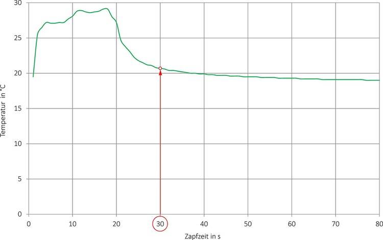 Nach Ablaufenlassen des Stagnationswassers muss gemäß DIN 1988-200 [7] und DIN EN 806-2 [8] aber spätestens nach 30 Sekunden die Temperatur des kalten Trinkwassers geringer sein als 25°C. Gelingt dieser Nachweis nicht, ist die Gebrauchstauglichkeit der Trinkwasserinstallation im Sinne dieser normativen Regel nicht mehr gegeben.