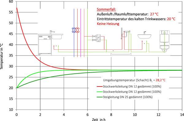 Aus diesen ersten Berechnungsergebnissen lässt sich grundsätzlich ableiten, dass die Temperatur des kalten Trinkwassers eher in den Sommermonaten kritische Grenzen erreicht und auch überschreitet als in den Wintermonaten. Alle beschriebenen passiven Maßnahmen zur thermischen Entkopplung, die im Winter wirksam sind, verlieren in den Sommermonaten mit hohen Raumlufttemperaturen weitgehend an Bedeutung. Eine unzulässige Temperaturerhöhung des kalten Trinkwassers im Winter und im Sommer über eine vorgegebene Temperatur (z.B. 25°C) kann daher nur mit einem aktiven Prozess, z.B. durch temperaturgeführtes Spülen oder durch Kühlung, verhindert werden.