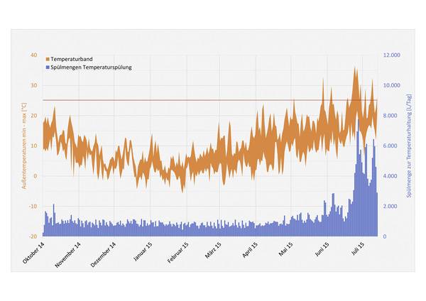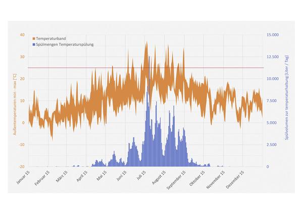 In den Wintermonaten wird die Auslösetemperatur nur selten erreicht, da die Umgebungslufttemperaturen in den Installationsräumen relativ niedrig sind. Das spiegelt sich in den geringen Spülvolumina von ca. 45 l/Tag wider. Sobald sich die Außenlufttemperaturen in den Sommermonaten erhöhen, sorgen die äußeren Wärmelasten für einen deutlichen Anstieg der Temperaturen im Gebäude. Die daraus resultierenden höheren Umgebungslufttemperaturen in den Installationsräumen führen zu einem massiven Anstieg der Spülvolumina bis auf 9000 l/Tag.