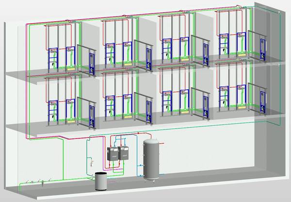 Eine thermische Entkopplung der kalten Trinkwasserleitungen von potenziellen Wärmequellen lässt sich jedoch nicht immer ohne Weiteres realisieren, wie z.B. bei horizontalen Verteilungskonzepten in temperaturkritischen Zwischendecken. Bereits in diesem Fall kann bei zu geringem Wasserverbrauch die vom kalten Trinkwasser aus der Umgebungsluft aufgenommene Wärme nicht mehr abgeführt werden. Dies führt ggf. zu einer Temperaturerhöhung des kalten Trinkwassers auf Umgebungslufttemperatur.