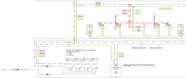 Damit eine durch die Aufgabenstellung vorgegebene Temperaturgrenze für das kalte Trinkwasser zu jedem Zeitpunkt vom Betreiber eingehalten werden kann, bedarf es eines aktiven Prozesses. Da auch manuell ausgelöste oder temperaturgeführte Spülprozesse limitiert sind, empfiehlt sich als leistungsfähige und kostengünstige Alternative zur automatischen Temperaturhaltung die Kaltwasserkühlung des kalten Trinkwassers in Strömungsteiler-Installationen. Mit der definierten Durchströmung aller Leitungsteile im Kemper-Hygiene-System (KHS) kann zu jeder Zeit – auch in den Sommermonaten – eine vorgegebene Temperatur des kalten Trinkwassers (z. B. < 20°C) vor jedem Armaturenanschluss sichergestellt werden, ohne dass Wasserverluste durch Spülmaßnahmen zur Temperaturhaltung entstehen. Gemeinsam mit der Zirkulation des Warmwassers bis unmittelbar vor die Entnahmestellen kann eine durch die Trinkwasserhygiene geforderte Temperaturhaltung sowohl im kalten als auch im erwärmten Trinkwasser sichergestellt werden.