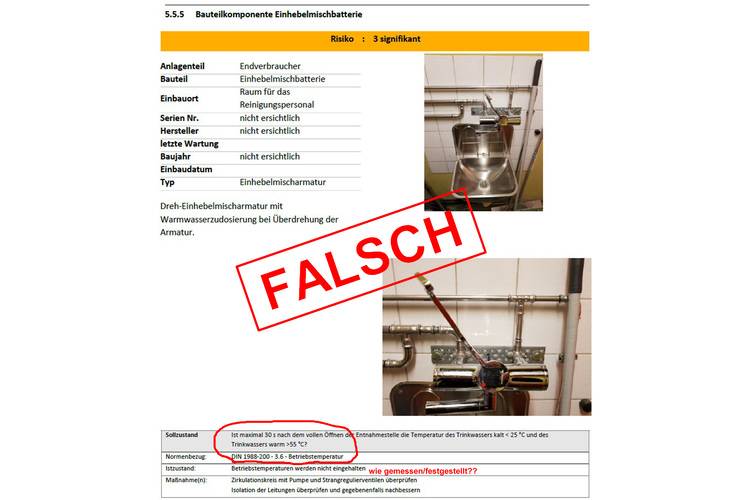 Hierin liegt jedoch bereits eine grundlegende Gefahr für die Nutzer der Installation, denn wenn ungeeignete Maßnahmen empfohlen werden, die vielleicht sogar zu einem Schaden an der Installation führen (z. B. thermische Desinfektion bei ungeeigneten Materialien) oder wenn bestimmte Gefährdungen gar nicht entdeckt werden und damit unerkannt bleiben, weil die technischen Mängel nur unvollständig oder oberflächlich ermittelt wurden (z. B. unzureichende Temperaturmessungen nur nach 30 Sekunden oder nur einzelne Temperaturmessungen am Trinkwassererwärmer (Spotmessung ohne kontinuierliche Datenerfassung), dann hat der verantwortliche Betreiber auch kaum eine Chance, seine Anlage fachgerecht sanieren zu lassen.