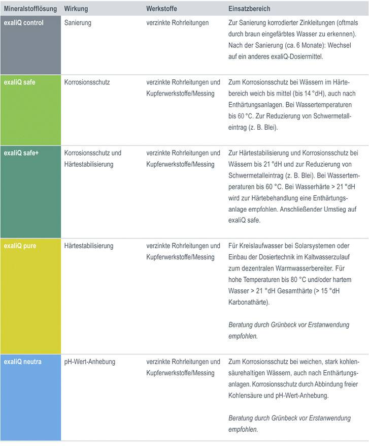 Verschiedenste Mineralstofflösungen: Grünbeck bietet auch die passenden exaliQ-Mineralstofflösungen an. Diese sind ebenso seit Mitte 2019 erhältlich und ersetzen die bisherigen Mineralstofflösungen der Exados-Reihe. Dabei wurden die einzelnen Rezepturen verbessert. Zudem sind die exaliQ-Mineralstofflösungen nun in bedarfsgerechten Größen erhältlich und lassen sich damit noch genauer auf die jeweilige Anforderung abstimmen. So eignet sich zum Beispiel exaliQ safe zum Korrosionsschutz bei Wässern im Härtebereich bis 14 °dH. Die Mineralstofflösung exaliQ safe+ sorgt für Härtestabilisierung und Korrosionsschutz bei Wässern mit einem Härtegrad bis 21 °dH. Beide Mineralstofflösungen können bei verzinkten Rohrleitungen und Kupferwerkstoffen sowie Messing eingesetzt werden und reduzieren auch den Schwermetalleintrag von beispielsweise Blei.