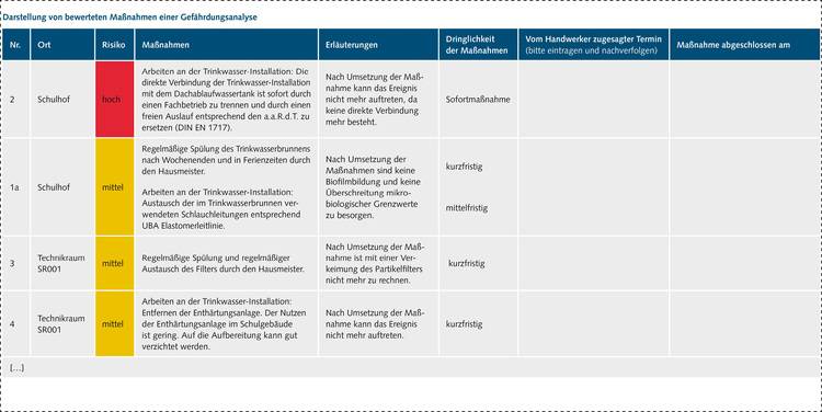 Insofern bietet sich als Zusammenfassung eine Tabellenform an, wie sie im Water Safety Plan (WSP, auch Wassersicherheitsplan) des UBA exemplarisch dargestellt ist. Sie enthält die „Sofortmaßnahmen sowie mittelfristig und längerfristig umzusetzenden Maßnahmen“. Erweitern ließe sich die Tabelle um zwei weitere Spalten, in die später die Umsetzungstermine der Maßnahmen eingetragen werden (Bild 4).