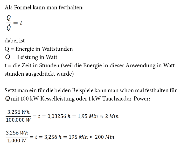 Ganz trivial kann man schon mal annehmen, dass ein leistungsstarker Kessel weniger Zeit benötigen würde um die 80 Liter aus dem Beispiel zu erwärmen als ein kleiner Tauchsieder. In Zahlen wird dies deutlicher. Ein Kessel mit 100 kW Leistung braucht zur Erwärmung weniger Zeit als ein Tauchsieder mit 1 kW Leistung.