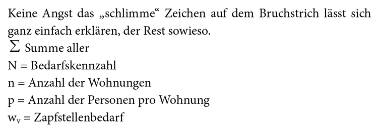 Da man einen Investor für den Bau eines Mehrfamilienhauses nur schwer diese Fragen stellen kann, gibt die entsprechende Norm, also die DIN 4708 Auskunft oder zumindest Vorschlagswerte. Beispielsweise für die Annahme wie viele Leute in eine geplante Wohnung einziehen werden, gibt es ein paar Schätzwerte, die sich zumindest in der Vergangenheit bewährt haben. Man bezieht einfach die Größe der Wohnung auf eine Anzahl von Personen.