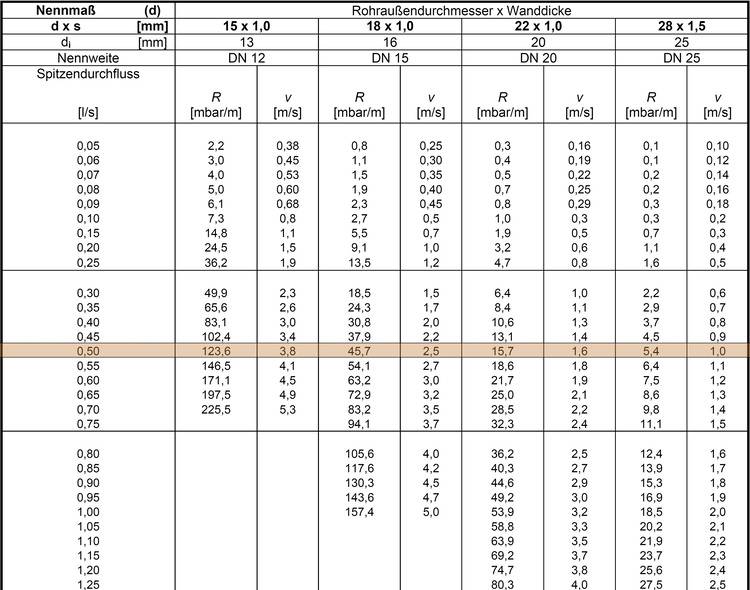 Die Rohrreibung wird übrigens in Millibar pro Meter (mbar)angegeben. Wollte man 0,5 l pro Sekunde als festen Volumenstrom transportieren, so könnte man das ganz sicherlich in einem DN 12, 15, 20 und 25 erledigen (siehe Tabelle zum Rohrreibungsdruckverlust). Der Druckverlust pro laufendem Meter würde in einem DN 12 entsprechend höher sein als in einem DN 25 – aber sehen Sie selbst.