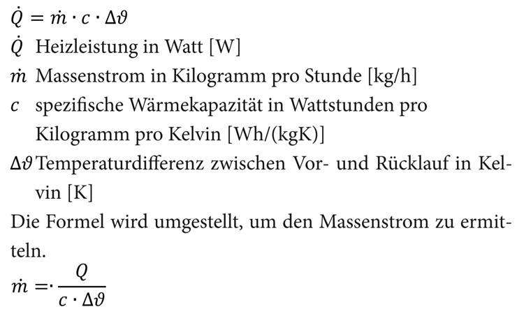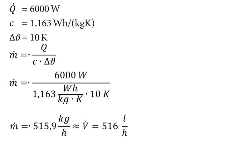 Der eigentliche Volumenstrom für die Umwälzpumpe lässt sich dann aus einer einfachen Umrechnung der bewegten Wassermasse zu einem Wasservolumen ermitteln. Für unsere Betrachtung reicht es völlig aus, die Masse von einem Kilogramm Wasser mit einem Liter Wasser gleichzusetzen.