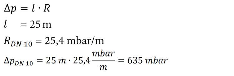 Eingesetzt in die Formel ergibt sich für das genannte Beispiel mit der Anforderung von 0,1 l/s und der Auswahl des Rohres als DN 10 ein gesamter Druckverlust von
