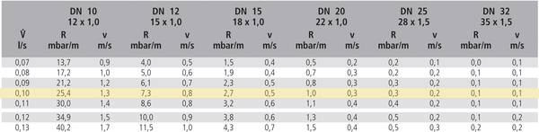 Schaut man in die abgebildete Tabelle für Druckverluste in Kupferrohren, findet man zugeordnet zu dem Volumenstrom einen entsprechenden Rohrreibungsdruckverlust.