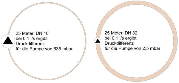 Der geforderte Volumenstrom von 360 l/h würde in einem dünnen Rohr der Nennweite 10 einen Pumpendruck von 635 mbar erfordern.